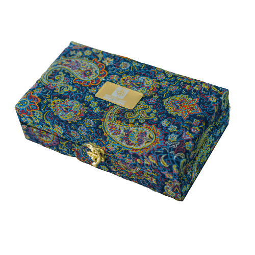 This package includes 3.5 grams of each premium highest quality flat head Super Negin saffron, 5 grams of certified rose buds and 15 grams of cardamom. The box also is handmade wooden with Termeh finish outside. This box would be perfect choice to surprise a tea lover.